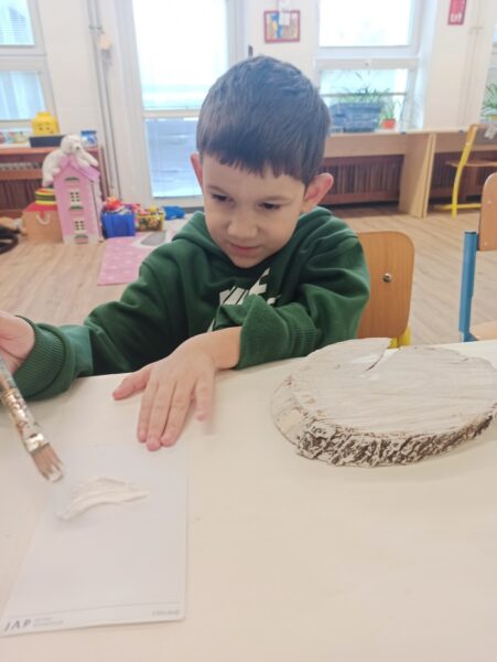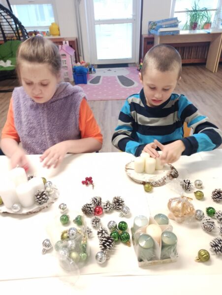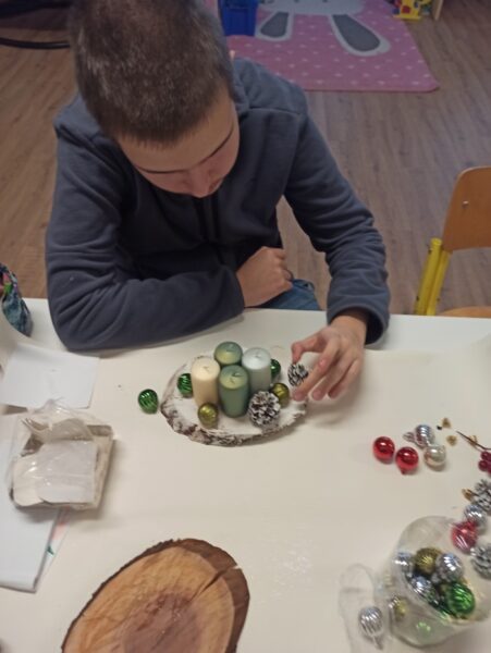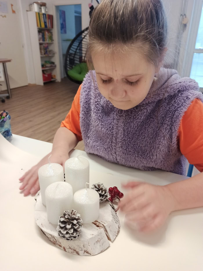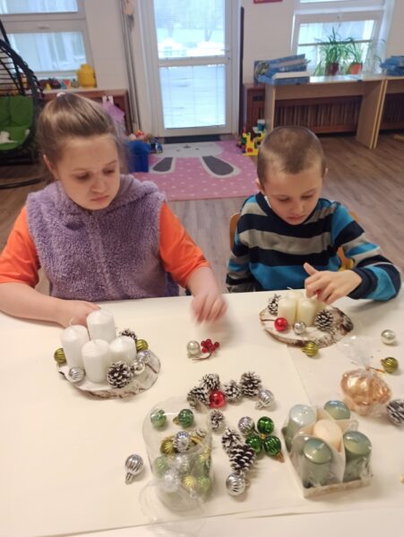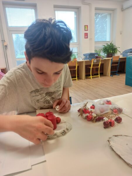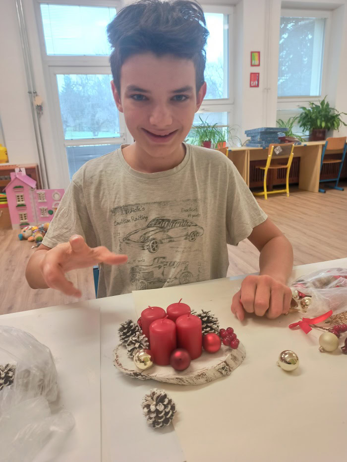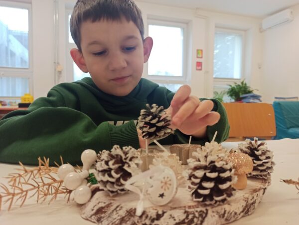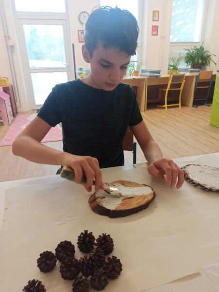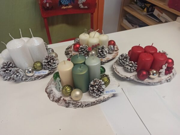 V rámci adventního času si žáci ve školní družině vyzkoušeli výrobu vlastních vánočních dekorací. Na začátku si natřeli dřevěné podstavce bílou barvou, aby vznikl zimní základ pro další tvoření. Poté si připravili šišky, svíčky, drobné ozdoby a pustily se do zdobení. Každý si mohl vybrat barvy i styl podle svého vkusu. Děti během tvoření rozvíjely svou fantazii, trpělivost i jemnou motoriku. Společně jsme si také pověděli o tradici adventu. Hotové dekorace si děti s hrdostí odnesly domů, aby jejich rodinám přinesly kousek kouzla Vánoc a připomínaly blížící se sváteční dny